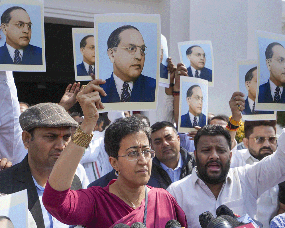 उन्होंने एक प्रेस कॉन्फ्रेंस में कहा, "भाजपा ने बाबासाहेब अंबेडकर की तस्वीर हटाकर अपना असली चेहरा दिखा दिया है। क्या उन्हें लगता है कि मोदी बाबासाहेब की जगह ले सकते हैं?" उन्होंने आरोप लगाया कि भाजपा के नेतृत्व वाले प्रशासन ने दिल्ली सचिवालय और विधानसभा दोनों में मुख्यमंत्री कार्यालय से अंबेडकर की तस्वीरें हटा दी हैं। निलंबित आप विधायकों ने बाद में विधानसभा परिसर में अंबेडकर चित्रों के साथ विरोध प्रदर्शन किया और "बाबा साहब का ये अपमान नहीं सहेगा हिंदुस्तान" के नारे लगाए।