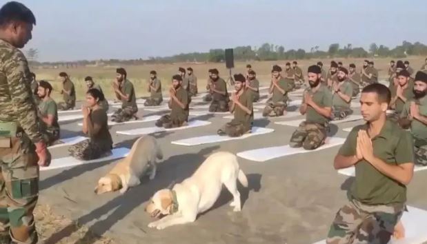 ये कुत्ते, जो आमतौर पर गश्त, ट्रैकिंग, बचाव अभियान और विस्फोटकों का पता लगाने में लगे रहते हैं, योग मैट पर अपनी चपलता का प्रदर्शन करते हैं। भारतीय सेना द्वारा जारी किए गए एक वीडियो में, दो लैब्राडोर कुत्तों को जम्मू में भारत-पाक सीमा पर नियंत्रण रेखा (एलओसी) के पास सैनिकों के एक समूह में शामिल होते देखा जा सकता है। कुत्तों ने खुद को समूह के सामने रखा और अपने प्रशिक्षक के निर्देशों का पालन किया, जैसे वे मुद्राएँ बदलते समय सैनिकों की हरकतों को दोहराते हैं।