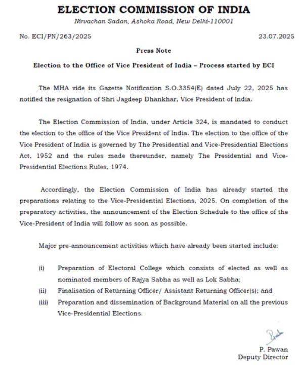 चुनाव आयोग ने उपराष्ट्रपति चुनाव को लेकर तीन अहम तैयारियां शुरू कर दी हैं। इसमें पहला कदम इलेक्टोरल कॉलेज यानी राज्यसभा और लोकसभा के निर्वाचित और मनोनीत सदस्यों की सूची तैयार करना है। दूसरा, मुख्य निर्वाचन अधिकारी और सहायक निर्वाचन अधिकारियों की नियुक्ति की जा रही है। तीसरा, पिछले सभी उपराष्ट्रपति चुनावों का दस्तावेजी विवरण और पृष्ठभूमि सामग्री तैयार कर साझा किया जा रहा है। धनखड़ ने अनुच्छेद 67(ए) के तहत राष्ट्रपति को पत्र सौंपा था, जिसमें उन्होंने लिखा कि स्वास्थ्य कारणों और डॉक्टरी सलाह के चलते वह तत्काल प्रभाव से उपराष्ट्रपति पद से इस्तीफा दे रहे हैं। उन्होंने राष्ट्रपति को उनके सहयोग और सौहार्दपूर्ण संबंधों के लिए धन्यवाद दिया और प्रधानमंत्री व मंत्रिपरिषद का भी आभार जताया।