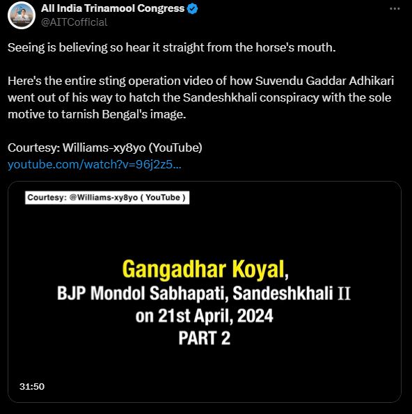 तो वहीं, जिसके बाद गंगाधर कायल ने अपनी सफाई दी, उन्होंने CBI डायरेक्टर को लेटर लिखकर कहा कि कथित स्टिंग वीडियो आर्टिफिशियल इंटेलिजेंस (AI) की मदद से बनाया गया है। गंगाधर ने कहा, मुझे विलियम्स नाम के एक यूट्यूब चैनल से अपलोड किया गया एक वीडियो मिला है। इसमें AI की मदद से मेरे चेहरे और आवाज का इस्तेमाल किया गया है, ताकि संदेशखाली घटना के खिलाफ जनता को गुमराह किया जा सके। साथ ही, CM ममता बनर्जी ने स्टिंग वीडियो को लेकर शनिवार को कहा, मैं काफी पहले से कह रही हूं कि संदेशखाली की पूरी घटना प्री-प्लान्ड थी। अब सच सामने आ गया है। ममता ने नादिया जिले के चकदह में एक चुनावी रैली में कहा कि भाजपा ने संदेशखाली की पूरी कहानी लिखी थी। उन्होंने सत्ता की चाह में हमारी मां-बहनों की इज्जत बेच दी। TMC के राष्ट्रीय महासचिव अभिषेक बनर्जी ने कहा, संदेशखाली की घटना मनगढ़ंत है। आज यह वीडियो सिर्फ बंगाल ही नहीं, पूरे देश में सच को सामने लेकर आया है। जिस महिला (रेखा पात्रा) ने शिकायत की थी, उसने भी इस वीडियो में कहा है कि मेरे साथ कुछ नहीं हुआ, मुझे साइन करने को कहा गया तो मैंने कर दिया। आपको बता दें, भाजपा ने बशीरहाट लोकसभा सीट (संदेशखाली इसी क्षेत्र के अंदर आता है) से रेखा पात्रा को अपना प्रत्याशी बनाया है। रेखा पात्रा संदेशखाली की उन महिलाओं में से एक हैं, जिन्होंने शाहजहां शेख और उसके करीबियों पर यौन उत्पीड़न और जमीन हड़पने का आरोप लगाया था। बशीरहाट में 1 जून को आखिरी 7वें फेज में वोटिंग है।