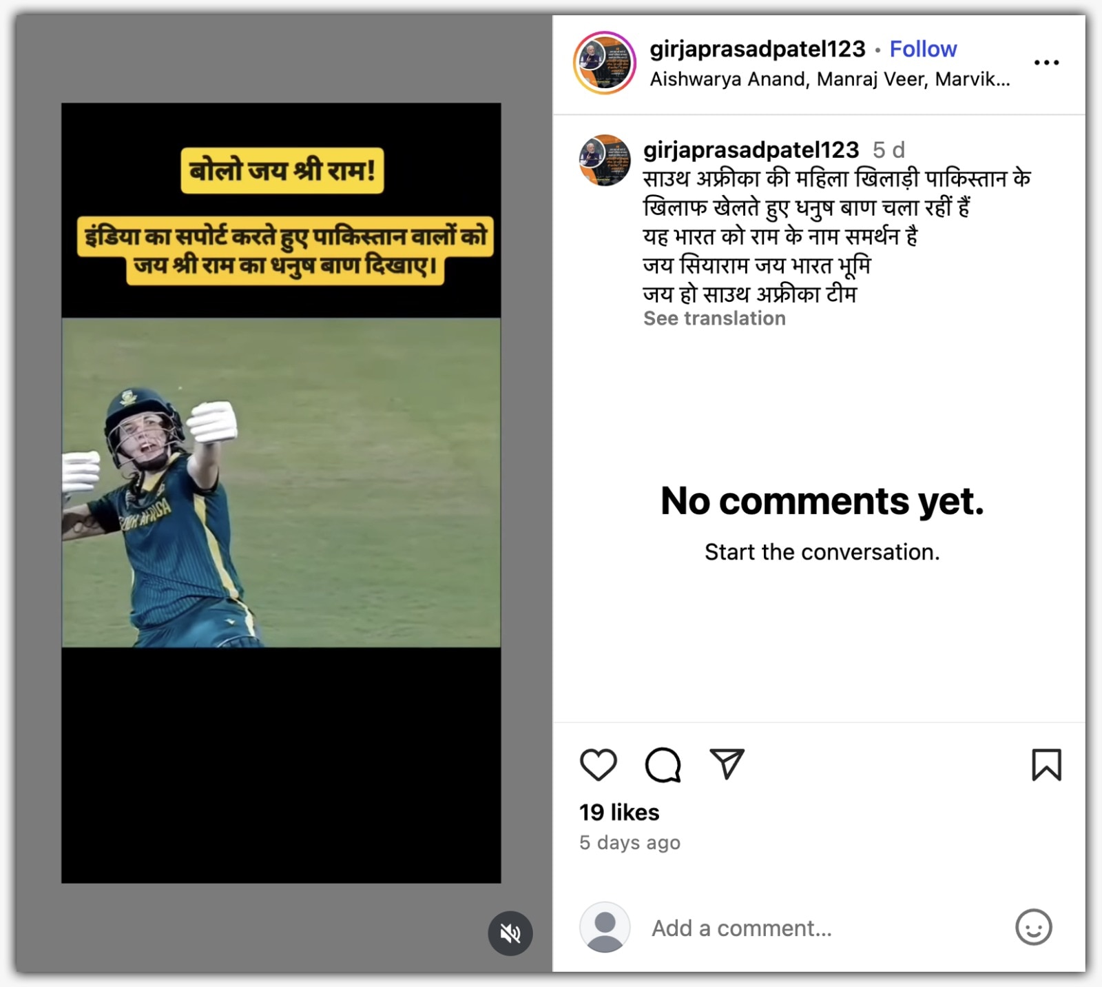 सोशल मीडिया पर इन दिनों दक्षिण अफ्रीका की एक महिला क्रिकेटर के जश्न का वीडियो तेज़ी से वायरल हो रहा है, जिसमें वह पिच पर धनुष-बाण चलाने का अभिनय करती दिख रही हैं। इस वीडियो के साथ यह दावा किया जा रहा है कि यह इशारा उन्होंने पाकिस्तान के खिलाफ मैच में किया और यह भारत तथा भगवान श्रीराम के प्रति उनके समर्थन का प्रतीक है। कई सोशल मीडिया प्लेटफॉर्म्स पर, विशेषकर इंस्टाग्राम और एक्स (पहले ट्विटर) पर, यूजर्स ने वीडियो को साझा करते हुए लिखा है कि यह 'राम के नाम पर भारत को समर्थन' है और 'जय सियाराम' के नारे लगाए जा रहे हैं।