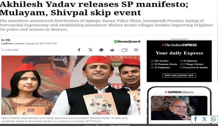इंडियन एक्सप्रेस की 2017 की रिपोर्ट के अनुसार, यह तस्वीर उस समय की है जब अखिलेश यादव ने समाजवादी पार्टी के नए अध्यक्ष के रूप में "काम बोलता है" कैंपेन के तहत घोषणा पत्र जारी किया था। उस मौके पर डिंपल यादव भी मौजूद थीं। दिन की रिपोर्ट प्रकाशित है जिसमें यह तस्वीर मौजूद है।