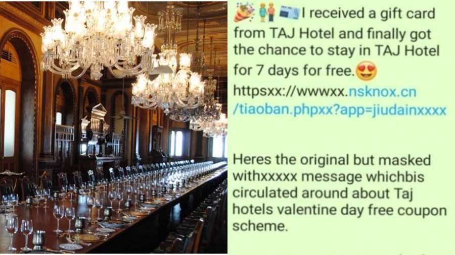 वेलेंटाइन डे पर एक संदेश वॉट्सऐप पर वायरल हो रहा था, जिसमें दावा किया गया कि वेलेंटाइन डे के अवसर पर ताज होटल कपल्स को 7 दिन का फ्री स्टे प्रदान कर रहा था | संदेश में कहा गया था कि प्रतिभागी एक कूपन या उपहार कार्ड जीत सकते थे, जिससे वो ताज होटल में 7 दिन तक मुफ्त में रुक सकते थे |