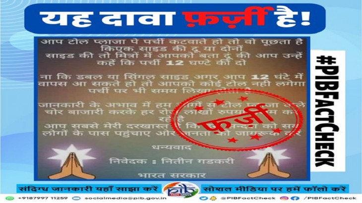 सोशल मीडिया पर टोल टैक्स को लेकर दावा किया जा रहा है कि केंद्रीय मंत्री नितिन गडकरी के आदेश के मुताबिक अगर आप अपनी यात्रा के दौरान 12 घंटे के अंदर लौट सकते हैं तो वापसी की यात्रा के लिए आपसे कोई टोल टैक्स नहीं लिया जाएगा. आपको बता दें कि, इस दावे में कहा जा रहा हैं कि, अगर आपसे टोल प्लाजा के काउंटर पर पूछा जाता है कि आपको एक साइड चाहिए या दो साइड। अगर आप 12 घंटे के अंदर लौटते हैं तो सिंगल साइड का ही टोल टैक्स काट लें। बताया जा रहा हैं कि, आपके रिटर्न पर कोई टोल टैक्स नहीं लगेगा। पर्ची पर समय लिखा होता है। जानकारी के अभाव में लोग दोनों तरफ से टोल टैक्स वसूलते हैं।