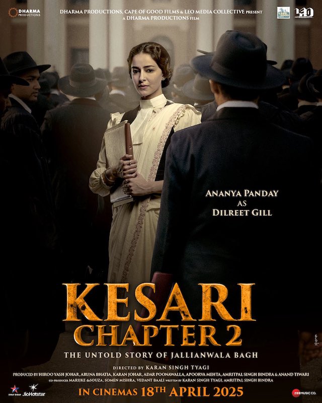 केसरी चैप्टर 2 के निर्माताओं ने अनन्या पांडे का फर्स्ट लुक रिलीज़ कर दिया हैं, जिसमें वह दिलरीत गिल नामक एक वकील की भूमिका में नजर आएंगी, और उनके फैंस पहले ही इस रोल को लेकर उत्साहित हैं। धर्मा प्रोडक्शंस ने सोशल मीडिया पर इस करैक्टर पोस्टर को शेयर किया, जिसमें अनन्या का करुणामयी लेकिन मजबूत किरदार पेश किया गया है। पोस्टर के साथ एक कैप्शन लिखा था, "करुणा से भरी, न्याय से प्रेरित। अनन्या पांडे को दिलरीत गिल के रूप में केसरी - चैप्टर 2 में पेश कर रहे हैं। 18 अप्रैल को सिनेमाघरों में, दुनिया भर में।"