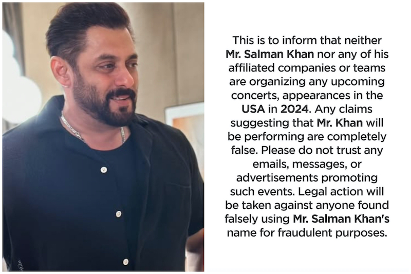 उन्होंने कहा, “मिस्टर खान के प्रदर्शन की बात करने वाले दावे पूरी तरह से झूठे हैं। कृपया ऐसे आयोजनों को बढ़ावा देने वाले किसी भी ईमेल, संदेशया विज्ञापन पर भरोसा न करें। धोखाधड़ी के उद्देश्यों के लिए सलमान खान के नाम का गलत इस्तेमाल करते पाए जाने वाले किसी भी व्यक्ति केखिलाफ कानूनी कार्रवाई की जाएगी।”