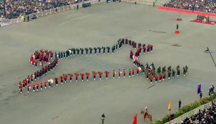 वहीं, सेनाओं के द्वारा कौरवों-पांडवों, सलामी देते जवान, एक पेड़ मां के नाम और चक्रव्यूह की आकृति तैयार की गई। समारोह के मुख्य संचालक कमांडर मनोज सेबेस्टियन थे। बीटिंग रिट्रीट कार्यक्रम का समापन 'सारे जहां से अच्छा' के साथ किया गया। समारोह के अंत में सभी बैंड मास्टर राष्‍ट्रपति के पास गए और बैंड वापस ले जाने की इजाजत मांगी। इसके बाद समारोह समाप्त किया गया। सेरेमनी से पहले 28 जनवरी को विजय चौक पर फुल ड्रेस रिहर्सल की गई थी। इसमें सेना, नेवी, एयरफोर्स और CAPF के बैंड ने शानदार धुनों का प्रदर्शन किया। इसे लेकर विजय चौक और उसके आसपास की कुछ सड़कों पर यातायात को प्रतिबंधित किया गया था। दिल्ली यातायात पुलिस ने एडवायजरी भी जारी की थी। बीटिंग रिट्रीट सेरेमनी की परंपरा राजा महाराजाओं के समय चली आ रही है। जब सूर्यास्त के बाद जंग बंद होने का ऐलान होता था। बिगुल बजाते ही सैनिक युद्ध बंद कर पीछे हट जाते थे। ये परम्परा 300 साल से भी ज्यादा पुरानी है। भारत के अलावा ब्रिटेन, कनाडा, अमेरिका समेत दुनिया के कई देशों में बीटिंग रिट्रीट सेरेमनी होती है। भारत में इसकी शुरुआत 1950 के दशक में हुई थी।