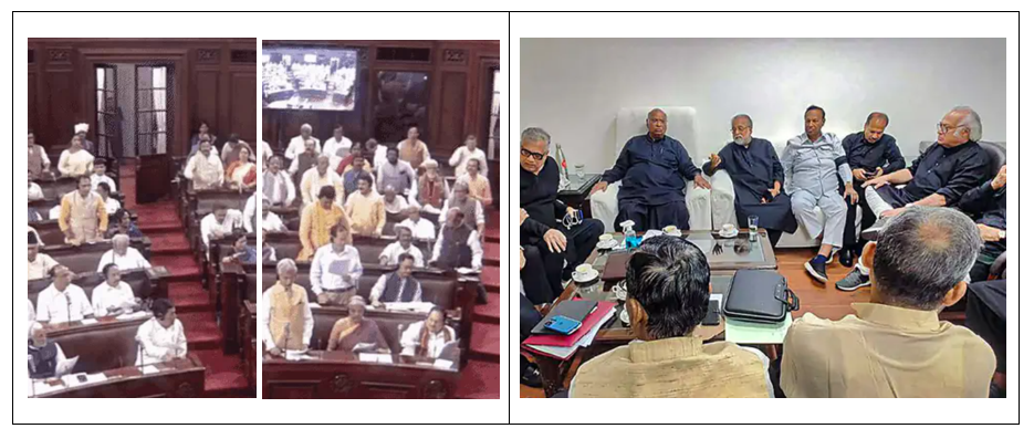 लोकसभा में हंगामा कर रहे विपक्ष को स्‍पीकर ओम बिड़ला ने फटकार लगाई। उन्होंने कहा, पूरा देश देख रहा है, आप कैसा उदाहरण पेश करना चाहते हैं। हंगामा नहीं रुका तो सदन दोपहर 2 बजे तक स्‍थगित कर दिया। जिसके बाद फिर सदन बैठा, लेकिन नारेबाजी लगातार जारी रही। एस जयशंकर और अधीर रंजन चौधरी के स्टेटमेंट के दौरान जमकर हंगामा हुआ, सदन 3 बजे तक स्थगित किया गया। फिर 2 बिल पास हुए और कार्यवाही शुक्रवार तक के लिए स्थगित कर दी गई। वहीं, राज्यसभा में शुरुआत में करीब एक घंटे कार्यवाही चली। विदेश मंत्री एस जयशंकर जब बोल रहे थे तब विपक्ष नारेबाजी करता रहा। जवाब में ‌BJP सांसदों ने मोदी-मोदी के नारे लगाए। जवाबी नारेबाजी में विपक्ष I.N.D.I.A-I.N.D.I.A के नारे लगाने लगा। शोर न रुकता देख सभापति जगदीप धनखड़ ने सदन को पहले 12 बजे तक, फिर 2 बजे तक स्थगित किया। उसके बाद जब कार्यवाही शुरू हुई तो विपक्ष सदन से वॉकआउट कर गया। इसके बाद सिनेमैटोग्राफ अधिनियम 1952 में संशोधन करने वाला बिल ध्वनि मत से पारित हो गया।