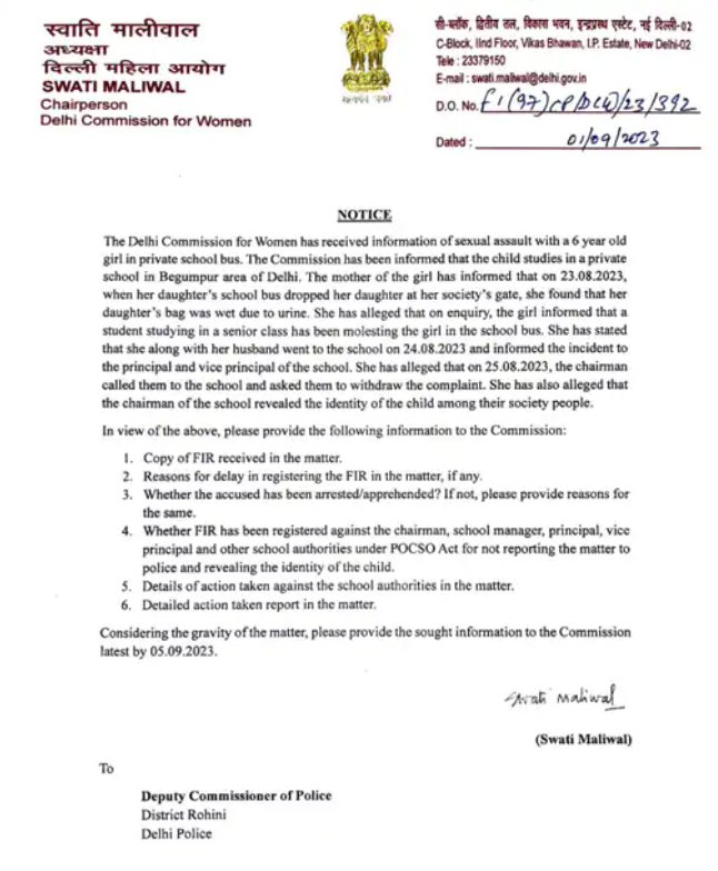 वहीं, दिल्ली महिला आयोग की अध्यक्ष स्वाति मालीवाल ने पूछा कि क्या स्कूल चेयरमैन, प्रिंसिपल, वाइस प्रिंसिपल और स्कूल के खिलाफ द प्रोटेक्शन ऑफ चाइल्ड फ्रॉम सेक्शुअल ऑफेंस (POCSO) एक्ट में मामला दर्ज किया या नहीं? आयोग ने 5 सितंबर तक पुलिस से रिपोर्ट मांगी है। साथ ही, दिल्ली में 1 सितंबर को 28 साल के आकाश ने 85 साल की बुजुर्ग महिला के साथ रेप किया। पुलिस के मुताबिक आकाश ने महिला के होंठ ब्लेड से काट दिए और उसे जान से मारने की कोशिश भी की। घटना की जानकारी मिलते ही स्वाति महिला से मिलने पहुंचीं। स्वाति ने पुलिस को नोटिस जारी कर 5 सितंबर तक कार्रवाई की रिपोर्ट मांगी है।