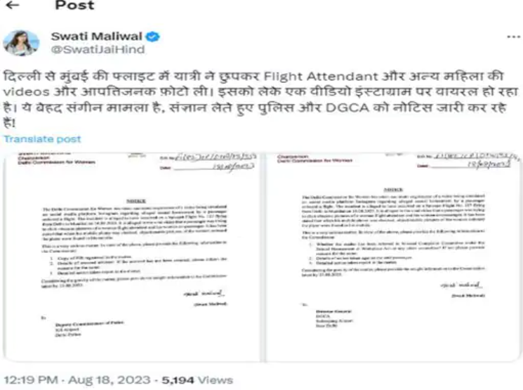 तो वहीं, DCW ने पुलिस से मामले में दर्ज FIR की कॉपी, गिरफ्तार आरोपी का विवरण और कार्रवाई की डिटेल्ड रिपोर्ट मांगी है। उन्होंने कहा कि अगर आरोपी को गिरफ्तार नहीं किया गया तो पुलिस को ऐसा नहीं करने का कारण बताना चाहिए। डीजीसीए से फोटो खींचने वाले यात्री के खिलाफ की गई कार्रवाई का विवरण मांगा गया है। ये भी पूछा गया है कि क्या घटना की सूचना कार्यस्थल पर यौन उत्पीड़न कानून के तहत आंतरिक शिकायत समिति या किसी अन्य समिति को दी गई थी। पुलिस और विमानन नियामक (DGCA) दोनों को 23 अगस्त तक ब्योरा उपलब्ध कराने को कहा गया है।