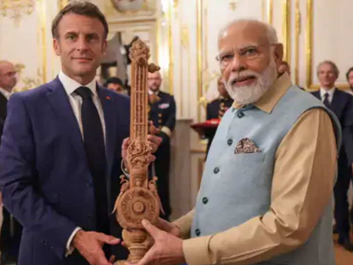 प्रधानमंत्री नरेंद्र मोदी ने फ्रांस के राष्ट्रपति मैक्रों को तोहफे में चंदन की लकड़ी से बना सितार गिफ्ट किया है। मैक्रों के अलावा PM मोदी ने उनकी पत्नी और फ्रांस की प्रधानमंत्री को भी तोहफे दिए हैं। PM ने राष्ट्रपति मैक्रों की पत्नी ब्रिजेट मैक्रों को सैंडलवुड बॉक्स में पोचमपल्ली इकत उपहार में दिया। ये तेलंगाना की पारंपरिक साड़ी होती है, जिस पर डाई करके पागाडु बंधु शैली में जिओमेट्रिकल पैटर्न बना होता है। इसके अलावा PM ने फ्रांस की प्रधानमंत्री एलिजाबेथ बॉर्न को मार्बल इनले वर्क टेबल और फ्रेंच नेशनल असेंबली की अध्यक्ष येल ब्रॉन-पिवेट को हाथ से बुना हुआ सिल्क कश्मीरी कालीन उपहार में दिया।