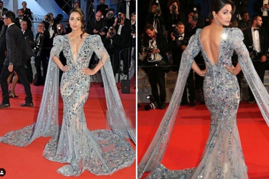 ड्रेस के नीचे हिना ने सी-थ्रू मिनी स्लिप पहनी थी जिसमें हेमलाइन पर अलंकरण और स्टार के डेकोलेटेज को बढ़ाने वाले शीर्ष थे। ये रिश्ता क्या कहलाता है के अभिनेता ने अपने लुक को कम से कम आकर्षक एक्सेसरीज के साथ जोड़कर आकर्षक बनाया। उन्होंने किलर हाई हील्स, डायमंड रिंग्स और मैचिंग ईयररिंग्स के साथ सिल्वर नुकीले पंप्स को चुना।