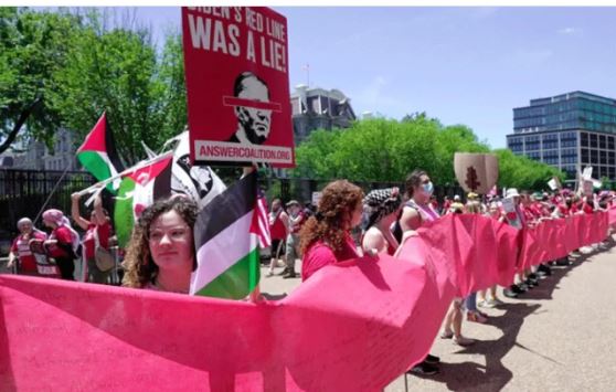 प्रदर्शन की कई तस्वीरें, जिनमें प्रदर्शनकारियों ने 'गाजा पर घेराबंदी को तुरंत समाप्त करें', 'फिलिस्तीन को मुक्त करें' और 'इजरायल को अमेरिकी सैन्य वित्तपोषण समाप्त करें' जैसे संदेशों के साथ तख्तियां थामे हुए थे, सोशल मीडिया पर वायरल हो गईं। तस्वीरों में मुख्य रूप से लाल रंग के कपड़े पहने हुए प्रदर्शनकारी दिखाई दिए।रफाह में अपने अभियान के साथ इजरायल द्वारा उल्लंघन की गई 'लाल रेखा' का प्रतीक बनाने के लिए, दक्षिणी गाजा शहर जहां युद्ध की शुरुआत से सैकड़ों फिलिस्तीनी शरण मांग रहे हैं, कुछ प्रदर्शनकारियों ने व्हाइट हाउस के चारों ओर एक पंक्ति बनाई और दो मील लंबा बैनर लपेटा।