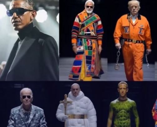 एआई फैशन शो, एलोन मस्क, जो बिडेन, नरेंद्र मोदी, डोनाल्ड ट्रम्प, व्लादिमीर पुतिन, बराक ओबामा, मार्क जुकरबर्ग, किम जोंग उन, टिम कुक, जस्टिन ट्रूडो, नैन्सी पेलोसी, शी जिनपिंग, आभासी फैशन, भविष्यवादी पोशाक।