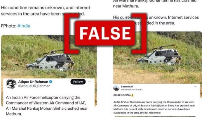 भारतीय वायु सेना के पीआरओ ने लॉजिकल फैक्ट्स को बताया कि वायरल दावा गलत है और एयर मार्शल पंकज मोहन का कोई हेलीकॉप्टर मथुरा में दुर्घटनाग्रस्त नहीं हुआ।