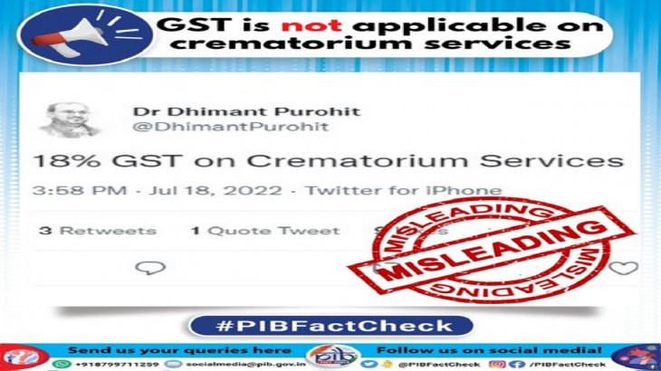 कई मीडिया रिपोर्ट्स में दावा किया जा रहा है कि केंद्र सरकार ने अंतिम संस्कार सेवाओं पर भी जीएसटी बढ़ा दिया है. जो पहले कम था लेकिन अब इसे बढ़ाकर 18 फीसदी कर दिया गया है। आपकी जानकारी के लिए बता दे कि इस तरह के मैसेज इन दिनों सोशल मीडिया पर खूब वायरल हो रहे हैं. सोशल मीडिया पर वायरल हो रहे एक मैसेज में दावा किया गया है कि केंद्र सरकार ने 'श्मशान सेवाओं पर 18 फीसदी जीएसटी' लगाया है. इसके साथ ही अंतिम संस्कार, दफनाने, दाह संस्कार या मुर्दाघर सेवाओं पर 18 प्रतिशत जीएसटी लगता है। लेकिन जब पीआईबी की टीम को इस वायरल मैसेज की सच्चाई का पता चला तो उन्होंने पाया कि ये मैसेज पूरी तरह से फर्जी हैं.