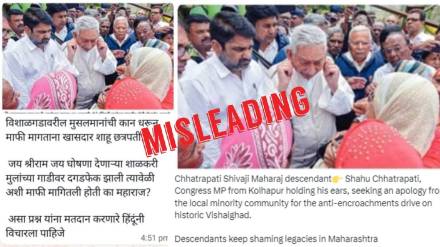 फैक्ट चेक न्यूज डेस्क !!! इन दिनों सोशल मीडिया पर एक तस्वीर वायरल हो रही है, जो महाराष्ट्र की बताई जा रही है। सोशल मीडिया पर वायरल हो रही तस्वीर में दावा किया जा रहा है कि छत्रपति शिवाजी महाराज के वंशज और कांग्रेस सांसद साहू छत्रपति ने अल्पसंख्यक समुदाय से कान पकड़कर माफी मांगी है. दरअसल, सोशल मीडिया पर एक तस्वीर तेजी से वायरल हो रही है. तस्वीर में कांग्रेस सांसद और छत्रपति शिवाजी महाराज के वंशज साहू छत्रपति को कुछ महिलाओं से बात करते हुए दिखाया गया है। इस बीच उसने कान भी पकड़ लिए। हालाँकि, तस्वीर को इस दावे के साथ साझा किया जा रहा है कि साहू शाहजी ने क्षेत्र में चलाए गए अतिक्रमण विरोधी अभियान के लिए विशालगढ़ के अल्पसंख्यक समुदाय से माफी मांगी। इसके साथ ही वायरल तस्वीर के कैप्शन में यह भी लिखा है, 'कोल्हापुर से कांग्रेस सांसद, छत्रपति शिवाजी महाराज के वंशज शाहू छत्रपति, कान पकड़कर स्थानीय अल्पसंख्यक समुदाय से माफी मांग रहे हैं।