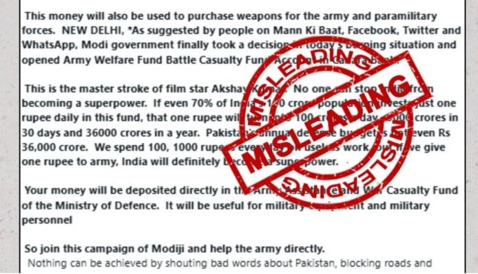 इन दिनों व्हाट्सऐप पर एक फर्जी मैसेज तेजी से वायरल हो रहा है, जिसमें दावा किया जा रहा है कि भारतीय सेना के आधुनिकीकरण और युद्ध में घायल अथवा शहीद हुए सैनिकों की मदद के लिए एक विशेष बैंक खाते में पैसा डोनेट करने की अपील की गई है। इस मैसेज को विशेष रूप से इसलिए भी वायरल किया जा रहा है क्योंकि इसमें बॉलीवुड अभिनेता अक्षय कुमार का नाम बतौर प्रस्तावक जोड़ा गया है, जिससे लोगों को यह मैसेज विश्वसनीय लगे।