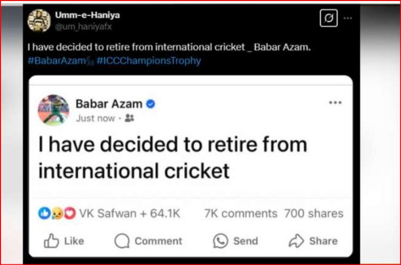 आजकल सोशल मीडिया पर किसी भी बात को झूठे दावे के साथ पेश करना बहुत आसान है। हालाँकि, इससे बहुत नुकसान भी होता है और यह खतरनाक भी है। सोशल मीडिया पर फर्जी खबरें बहुत तेजी से वायरल हो जाती हैं। इस झूठी खबर से आपको सावधान करने के लिए हम इंडिया टीवी फैक्ट चेक लेकर आए हैं। इन दिनों सोशल मीडिया पर एक पोस्ट वायरल हो रही है, जिसमें दावा किया जा रहा है कि पाकिस्तानी क्रिकेटर बाबर आजम ने अंतरराष्ट्रीय क्रिकेट से संन्यास की घोषणा कर दी है। यह पोस्ट सोशल मीडिया पर वायरल हो रही है।