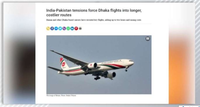 ‘Dhaka Tribune’ में प्रकाशित एक रिपोर्ट के मुताबिक, भारत-पाकिस्तान तनाव के कारण उपमहाद्वीप का एक बड़ा हवाई गलियारा प्रभावित हुआ है, जिससे बांग्लादेश की फ्लाइट्स को भी अपने पारंपरिक रूट बदलने पड़े हैं। लंदन, रोम, इस्तांबुल और टोरंटो जाने वाली उड़ानों को अब दो घंटे अधिक लग रहे हैं, जिससे उड़ानों की लागत और संचालन खर्च बढ़ा है।
