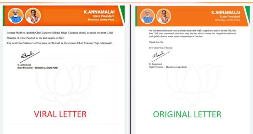 विश्वास न्यूज ने अपनी जांच में पाया कि यह पत्र फर्जी है। यह गलत है। नहीं। अन्नामलाई ने यह पत्र शिवराज सिंह चौहान और योगी आदित्यनाथ को लेकर नहीं जारी किया है.