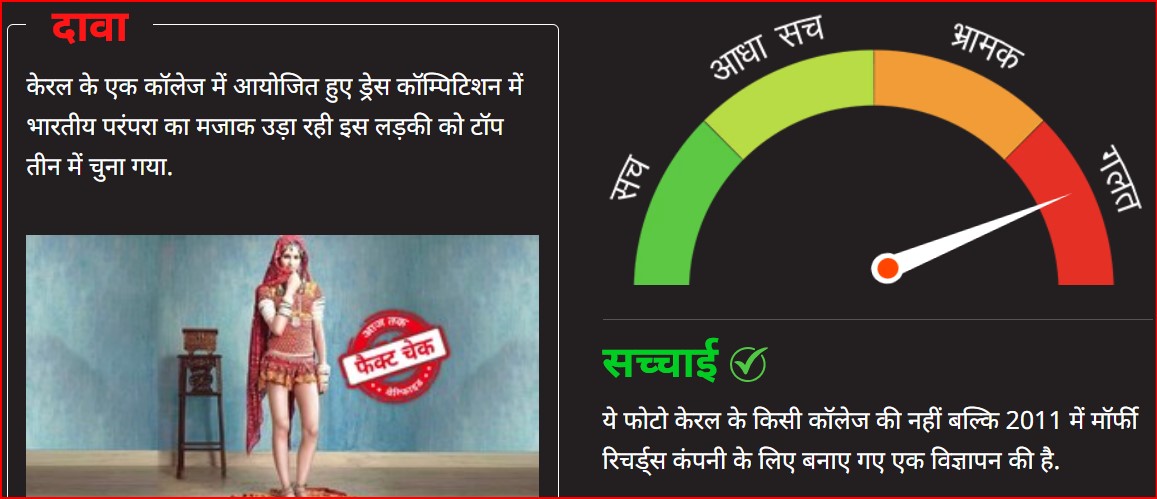 फैक्ट चेक न्यूज डेस्क !! इस समय सोशल मीडिया पर पारंपरिक राजस्थानी पोशाक पहने एक लड़की की फोटो ट्रेंड कर रही है। फोटो में देखने वाली बात ये है कि लड़की ने ऊपर कपड़े तो पहने हुए हैं लेकिन उसके पैर ढके नहीं हुए हैं. ऐसा लग रहा है कि ड्रेस को नीचे से आधा काटा गया है। फोटो पर नाराजगी जताते हुए कहा जा रहा है कि यह लड़की केरल के एक कॉलेज में आयोजित ड्रेस कॉम्पिटिशन में टॉप थ्री में चुनी गई थी. यूजर्स लड़की के कपड़ों पर आपत्ति जता रहे हैं और लिख रहे हैं कि महिलाओं को आगे बढ़ने का मौका दिया जा रहा है लेकिन वे इस पर काम करने के बजाय भारत की परंपराओं का मजाक उड़ाने में लगी हैं।