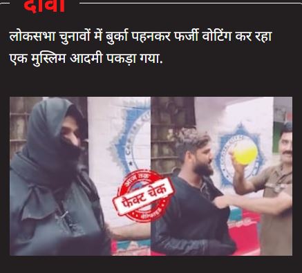 चुनावी हलचल के बीच सोशल मीडिया पर 'बुर्के में रहने दो बुर्का ना हटाओ, बुर्का जो हट गया तो भेद खुल जाएगा' कैप्शन के साथ एक वीडियो वायरल हो रहा है। वीडियो के जरिए यह कहने की कोशिश की जा रही है कि लोकसभा चुनाव में एक मुस्लिम शख्स बुर्का पहनकर फर्जी वोटिंग करते हुए पकड़ा गया था.
