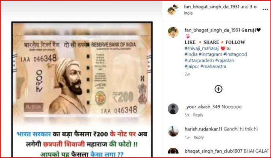 सोशल मीडिया प्लेटफॉर्म इंस्टाग्राम पर एक यूजर @fan_bhagat_singh_da_1931 द्वारा एक पोस्ट शेयर की गई। इसमें एक तस्वीर दिख रही है, जिसमें 200 रुपये के भारतीय नोट पर छत्रपति शिवाजी महाराज की फोटो लगी हुई है। पोस्ट में दावा किया गया, “भारत सरकार का बड़ा फैसला! 200 रुपये की नोट पर अब लगेगी छत्रपति शिवाजी महाराज की फोटो। आपको यह फैसला कैसा लगा?” यह दावा इतना वायरल हुआ कि कई लोग इसे सच मानने लगे। लेकिन जयपुर वोकल्स की ओर से किए गए फैक्ट चेक में ये साफ हो गया कि यह दावा पूरी तरह झूठा है।