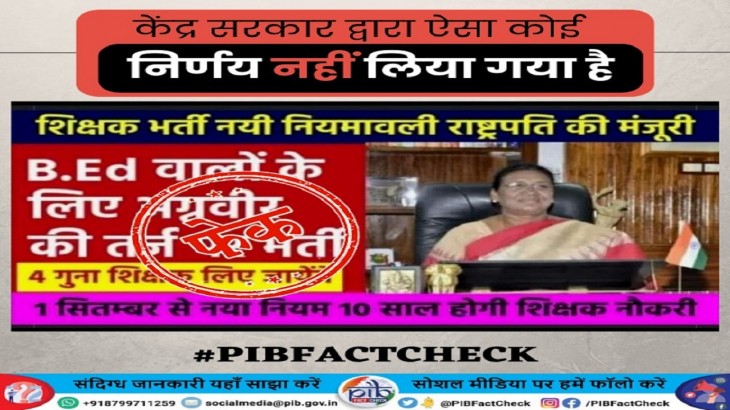 सोशल मीडिया पर दावा किया जा रहा है कि शिक्षकों की भर्ती भी आंगनवीर योजना की तर्ज पर की जाएगी। चूंकि सेना में चार साल की नियुक्ति का मानक रखा गया है, अब शिक्षकों की दस साल की नौकरी होगी. इस नियमन को राष्ट्रपति की मंजूरी मिल गई है। लेकिन जब इस मैसेज की पीआईबी फैक्ट चेक टीम ने जांच की तो यह पूरी तरह फर्जी निकला। टीम का कहना है कि ये सभी दावे पूरी तरह से फर्जी हैं। सरकार की ओर से ऐसा कोई फैसला नहीं लिया गया है। इस मैसेज को पीआईबी ने अपने ट्विटर हैंडल पर शेयर किया है।