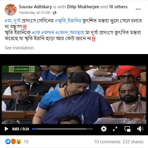 2016 में संसद में जवाहरलाल नेहरू विश्वविद्यालय में मिले एक कथित पत्रक के बारे में बोलते हुए, केंद्रीय महिला एवं बाल विकास मंत्री स्मृति जेड ईरानी का एक क्रॉप्ड वीडियो, झूठे दावों के साथ वायरल हो रहा है, जिसमे उन्होंने हिंदू देवी दुर्गा का अनादर किया हैं । मगर जब हमने ईरानी ने एक पत्रक का एक अंश पढ़ा, जिसके बारे में उन्होंने दावा किया था कि वह कथित रूप से जेएनयू में 2016 में लोकसभा भाषण के दौरान पाया गया था । वीडियो संसद सदस्य और अखिल भारतीय तृणमूल कांग्रेस के राष्ट्रीय प्रवक्ता की पृष्ठभूमि में वायरल है ।